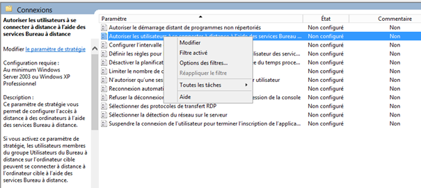 Étape 5 : Sur le paramètre « Autoriser les utilisateurs à se connecter à distance à l’aide des services Bureau à Distance« , faites un clic droit, puis sélectionnez « Modifier« .