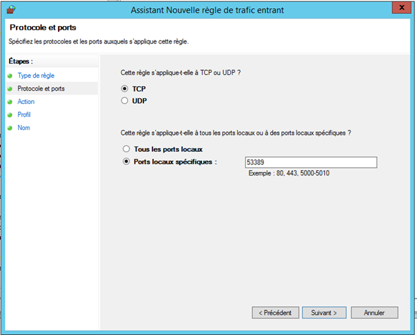 Étape 9 : Cette règle s’applique au protocole TCP, et le port sera donc le 55389