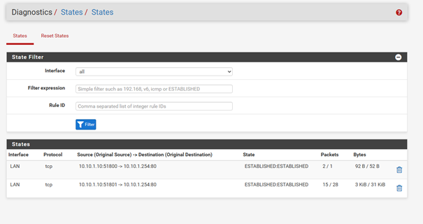 Étape 1 : Accédez à « Diagnostics » puis à « States ». Ici, vous trouverez tous les logs relatifs à pfSense
