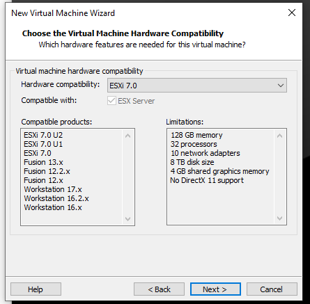 Dans Hardware Comptatibility, choisir ESXI 7.0 puis Next