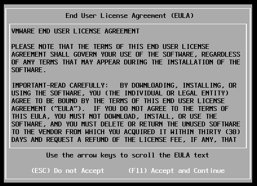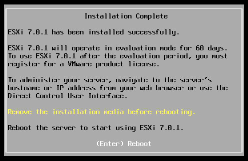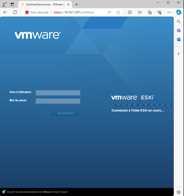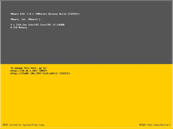 Une fois le redémarrage fait, nous nous retrouvons sur cette page qui nous indique que notre hyperviseur a pour IP 10.10.1.107